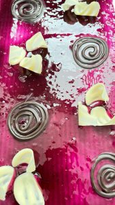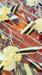 Торт “Рубиновый рассвет” представляет собой три слоя выпеченного полуфабриката, прослоены кремом “Сливочно-молочный”. Поверхность заглазирована кремом «Сливочно-молочный» и декорирована крошкой выпеченного полуфабриката “Марсала”.