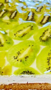 Представляет собой слой полуфабриката медового «Нежный», пропитанный сиропом для промочки №96 (крепленый) и покрытый кремом «Нежный», состоящим из крема растительного, смешанного с наполнителем Ароматик «Киви». Верхняя поверхность отделана свежими фруктами и заглазирована желе «Кларо».