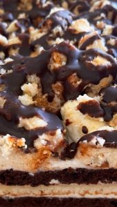 Представляет собой два слоя полуфабриката «Изысканный» и слой бисквитного полуфабриката с пастой для взбивания, пропитанные сиропом для промочки (крепленый) №96 и соединенные кремом «Сметанный» новый. Верхняя и боковая поверхности заглазированны этим же кремом. На верхнюю поверхность в виде горки уложены кубики бисквитного полуфабриката с пастой для сбивания, смешанные с кремом «Сметанный» новый. Боковая поверхность осыпана крошкой полуфабриката «Изысканный». Верхняя поверхность отделана кремом шоколадно-растительным.